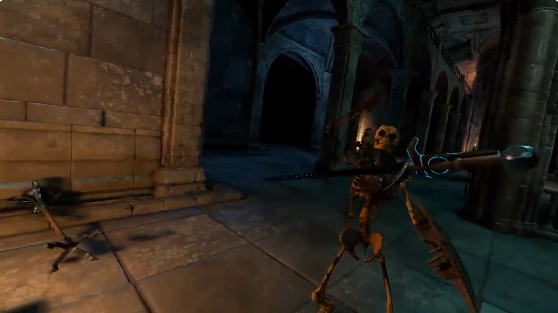 《地牢突襲者》是由英國(guó)游戲開(kāi)發(fā)商Simon Barrett開(kāi)發(fā)的一款專門針對(duì)虛擬現(xiàn)實(shí)技術(shù)設(shè)計(jì)的VR游戲。游戲中,玩家身處昏暗的中世紀(jì)石屋之中,正在與兇猛的骷髏戰(zhàn)士進(jìn)行酣戰(zhàn)。不同于以往的游戲,VR視角下的玩家需要舞利刃與敵人進(jìn)行肉搏,而骷髏等怪物不再是智商低下的AI,他可以用盾牌抵擋玩家的攻擊并進(jìn)行反擊。戰(zhàn)斗中的每次兵器碰撞都會(huì)迸發(fā)出美妙的火花。