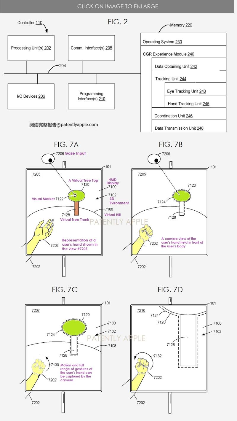 專利圖2說明了一個(gè)計(jì)算機(jī)系統(tǒng)的控制器,該控制器被配置為管理和協(xié)調(diào)用戶的CGR體驗(yàn)??刂破?110包括軟件、固件和/或硬件的適當(dāng)組合;圖7A-7D圖示了選擇導(dǎo)航目標(biāo)并根據(jù)物理手勢導(dǎo)航到導(dǎo)航目標(biāo)。