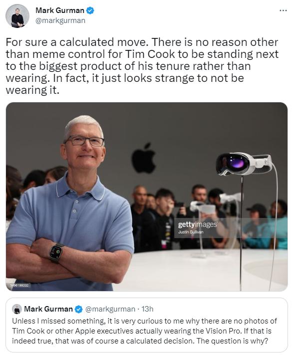 在結(jié)束了對(duì)蘋(píng)果最新產(chǎn)品的忙碌報(bào)道后,彭博社記者馬克·格爾曼注意到了一件奇怪的事情:沒(méi)有蘋(píng)果CEO庫(kù)克或其他蘋(píng)果高管佩戴Apple Vision Pro頭顯的照片。