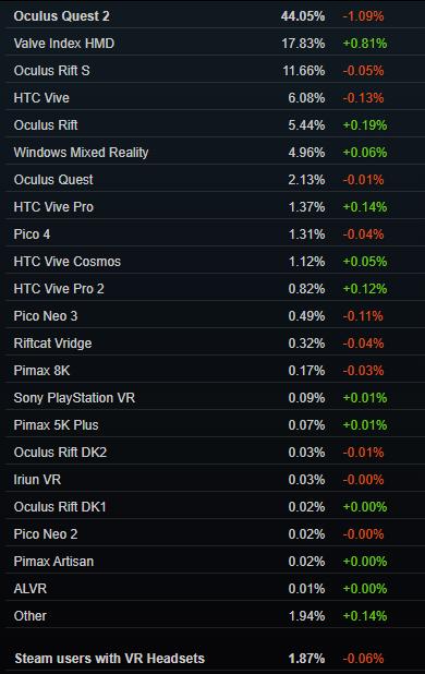 近日,Steam平臺公布了2023年5月的軟件與硬件調(diào)查報(bào)告。本月報(bào)告數(shù)據(jù)顯示,Steam平臺VR用戶占比相比4月有了小幅度下降至1.87%(-0.06%)。其中,Meta Quest 2占比下降較多,相反Valve Index有較明顯的增長。