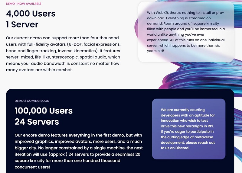 RP1是一家為元宇宙和虛擬體驗提供工具和開源客戶端架構(gòu)的供應(yīng)商,本周RP1公布了其后端技術(shù)的第一個公開演示,該公司聲稱該技術(shù)能夠?qū)?0萬個獨特的個體整合到單一、近乎無限可擴展且持久的虛擬體驗之中(可擴展到數(shù)十億)。