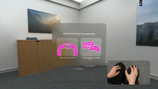 例如在Happy Beam游戲中,用戶需要向畫面上出現(xiàn)的云朵發(fā)射快樂光束,讓這些脾氣暴躁的云彩高興起來。Happy Beam能夠支持兩種交互方式,一種是通過特定手勢瞄準并發(fā)射,另一種則支持鍵盤、游戲手柄等藍牙配件。