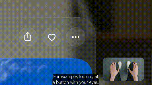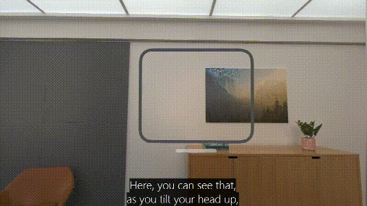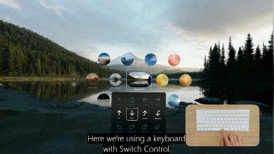 并非每個人都能在其環(huán)境中舒適或自由的移動。對于肢體無法自由活動的用戶,蘋果也提供了僅使用眼睛與應用程序進行交互的輔助功能。通過這些功能,用戶可以選擇、滾動、長按或拖動界面中的項目。除了僅使用眼睛進行交互。用戶還可以通過蘋果提供的Switch Control切換控制功能,來調(diào)整攝像頭在世界空間中的位置,例如用戶可以通過帶有Switch Control功能的鍵盤來將攝像頭的位置下移,而無需實際移動自己的身體。