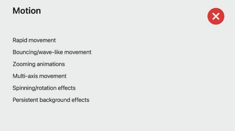 為了改善這一問題,蘋果提供了Reduce Motion(減弱動態(tài)效果)輔助功能,提出了開發(fā)者應當為快速移動、彈跳/波浪式移動、縮放動畫、多軸移動、旋轉(zhuǎn)效果、始終開啟的背景效果提供替代方案,例如交叉淡入淡出,以防這些用戶產(chǎn)生不適。