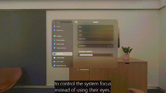蘋果還提供了輸入指針控制輔助功能,允許人們使用不同的輸入源來控制系統(tǒng)焦點,而不是只能使用眼球追蹤功能來追蹤眼睛注視的地方。使用眼睛作為焦點是Vision Pro默認設置,但在用戶可以將系統(tǒng)焦點更改為由頭部位置、手腕位置甚至是食指驅(qū)動,以最大限度適用不同的人群。