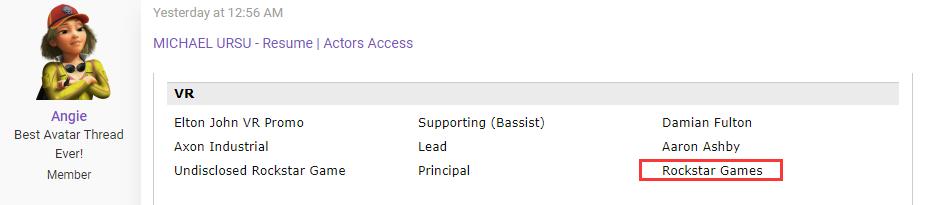 在Ursu的簡歷中,在“VR”一欄下列出了「Elton John VR」宣傳片和「Wanderer VR」。而一款“未命名的Rockstar游戲”也赫然在列。