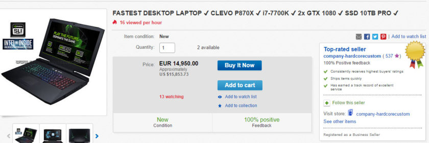 該型號(hào)是有ebay上頂級(jí)賣家CEG-Hardcorecustom推出的,售價(jià)為15853美元。在同等價(jià)位下,玩家完全可以組建一臺(tái)性能比CLEVO P870X要高的臺(tái)式機(jī)。不過考慮到CLEVO P870X是一款筆記本,高昂的售價(jià)也在預(yù)料之內(nèi),不過官方后期的價(jià)格可能會(huì)低于此價(jià)格。
