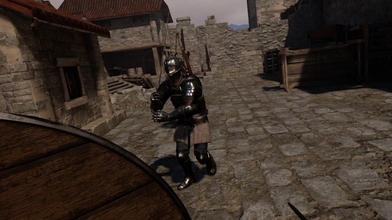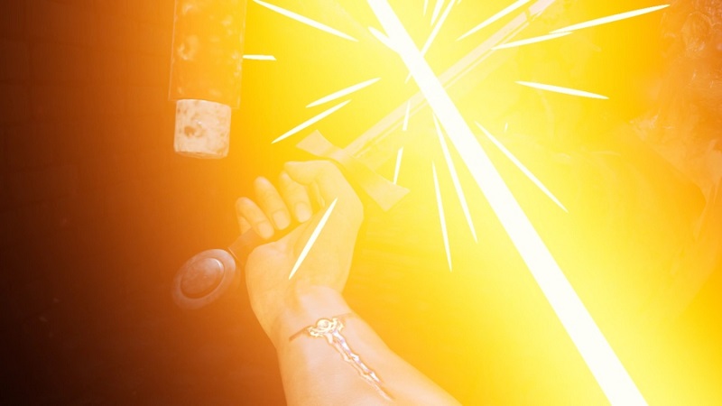作為一款VR游戲,本作的格擋和彈反并不是玩家按一個(gè)鍵就可以完成,玩家需要用自己的雙手和雙臂做出模擬真實(shí)的動(dòng)作,才能完成一次成功的格擋或彈反。具體的實(shí)現(xiàn)方式是:當(dāng)玩家一手持盾時(shí),可以用盾牌擋在敵方攻擊的線路前方,這樣敵方的攻擊就會(huì)被盾牌化解,但此時(shí)敵方并不會(huì)出現(xiàn)空檔;而當(dāng)玩家用手中的武器在對(duì)方攻擊的同時(shí)迎在其攻擊線路上,系統(tǒng)就會(huì)產(chǎn)生彈反效果,武器碰撞處會(huì)出現(xiàn)閃光和音效(砰的一聲),敵人也會(huì)因?yàn)閺椃炊a(chǎn)生一個(gè)身體后仰的空檔,此時(shí)攻擊敵人的軀干往往就會(huì)將其擊倒。