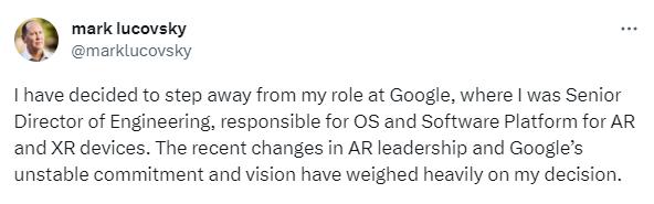 在Twitter發(fā)布的一份聲明中,Lucovsky將“AR部門領導層最近的變動以及谷歌不穩(wěn)定的承諾和愿景”作為他離職的原因。