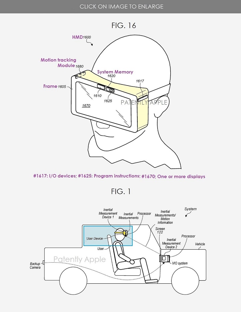 蘋(píng)果專(zhuān)利圖16示出了被配置為確定相對(duì)慣性運(yùn)動(dòng)的頭戴式用戶設(shè)備的示例;圖1示出了在移動(dòng)參照物(車(chē)輛)中的用戶和包括用于確定用戶相對(duì)于參照物的相對(duì)運(yùn)動(dòng)的多個(gè)慣性測(cè)量裝置的系統(tǒng)。