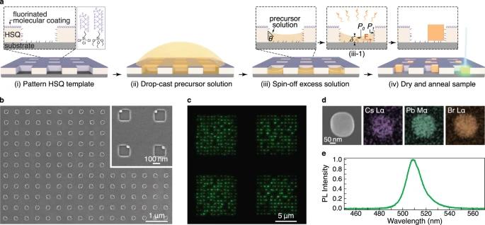 迄今為止,由于材料的脆弱性和在傳統(tǒng)制造過程中容易損壞的特點,在納米尺度上集成這些材料一直是一個挑戰(zhàn)。為了克服這一障礙,麻省理工學院研究人員開發(fā)了一種技術,可以精確單個鹵化物鈣鈦礦納米晶體,并將其位置控制在50納米以內(一張紙的厚度為10萬納米)。