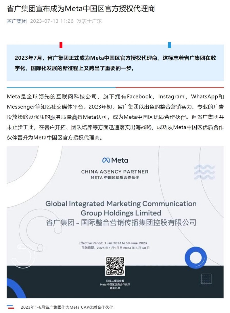 7月13日,營銷傳播公司“省廣集團”發(fā)布公告,正式成為Meta中國區(qū)官方授權代理商。