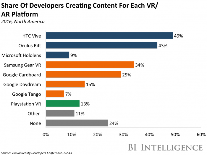 VR游戲的用戶基礎(chǔ)還處于起步階段。雖然2016對于VR市場來說是重要的一年,不過它還未必很大——至少和其將來的潛力相比不是很大。BI Intelligence預(yù)測VR頭盔的出貨量同比增長1047%,在2016年會超過800萬臺。不過,這里頭包括了一些無法運行更加復(fù)雜的VR游戲的設(shè)備,比如三星的Gear VR。讓內(nèi)容跨平臺使得它能夠向更多的用戶開放。
