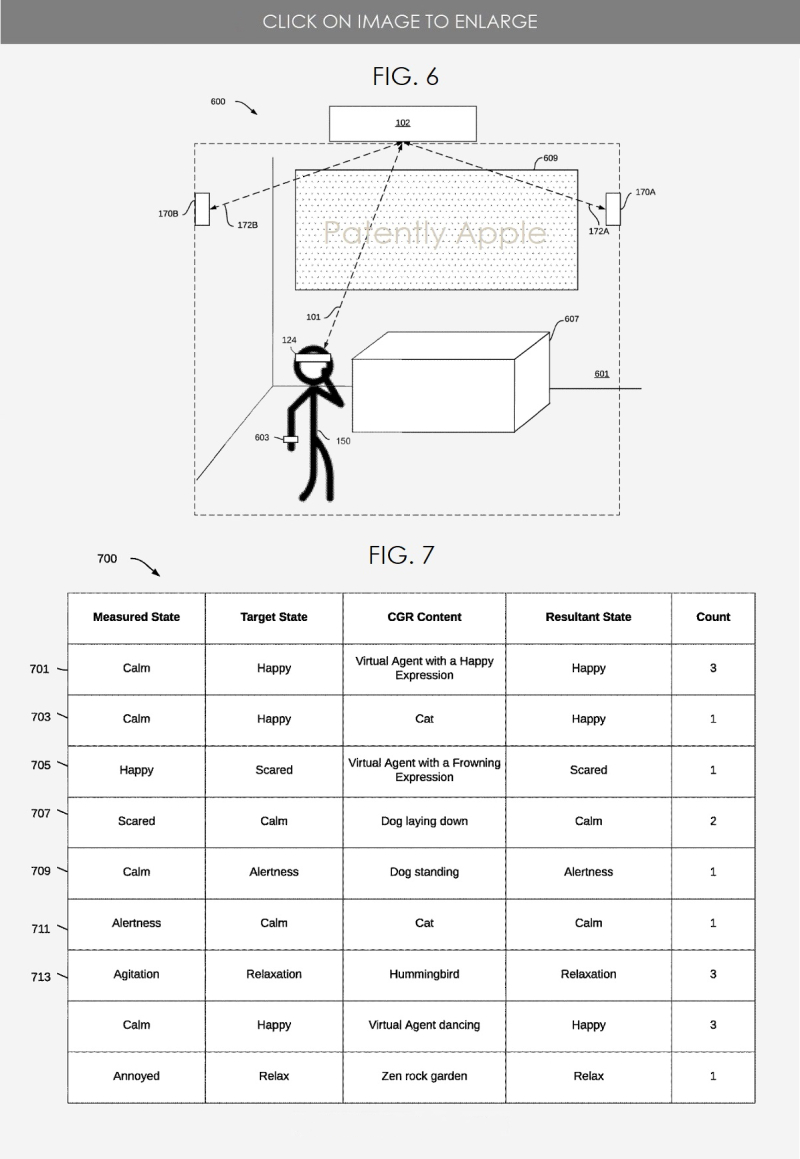在另一個例子中,蘋果指出,過去的用戶狀態(tài)數據可能包括大多數用戶的常見反應,例如當HMD呈現旨在嚇唬用戶的CGR內容時所產生的恐懼狀態(tài)。作為另一個示例,過去的用戶狀態(tài)數據可以包括大多數用戶的其他常見反應,例如當HMD呈現旨在使用戶快樂的CGR內容(例如小狗)時所產生的快樂狀態(tài)。