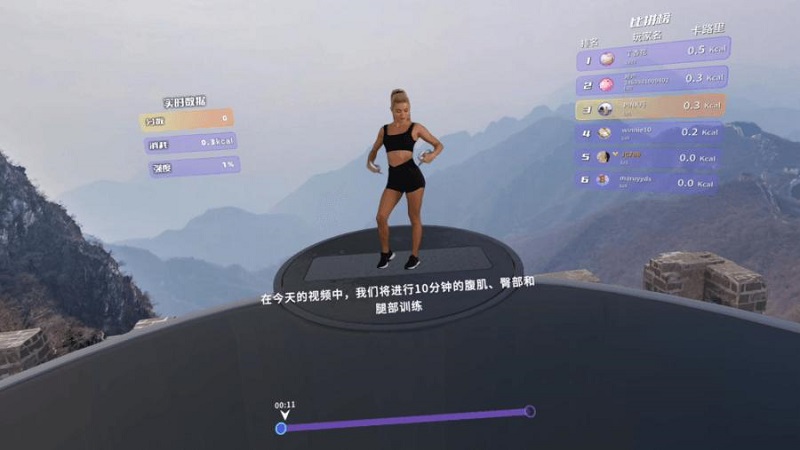 進入第一節(jié)課程,我看到了全新設計的課程界面。在畫面中央,也就是用戶視線的正前方是帕梅拉的形象,她將在一間“一對一”的虛擬教室中帶領我開始10分鐘的健身課程,虛擬教室以長城的實拍照片作為背景,畫面下方則是課程的時間軸。