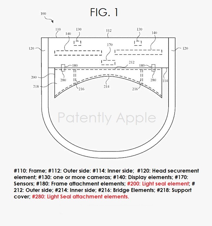 蘋果專利圖1示出了具有光密封元件的頭戴式設備俯視圖。有關更多詳細信息,請查看蘋果專利申請20230229008。