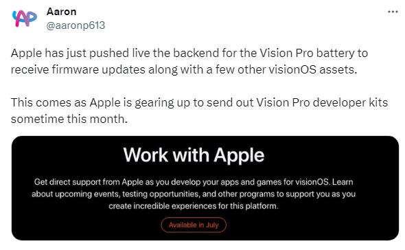這些代碼的添加是在蘋果計劃向特定開發(fā)者推出開發(fā)者工具包之前進行的,蘋果在其開發(fā)者網(wǎng)站表示,計劃7月推出Apple Vision Pro開發(fā)者工具包和其他開發(fā)者工具。
