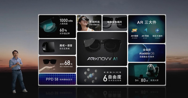 ARknovv A1重量僅有68克,采用全新高清、高亮、高透過率的光學(xué)顯示系統(tǒng),在電致變色鏡片的加持下,突破傳統(tǒng)AR眼鏡桎梏,為用戶帶來全天候穿戴使用的能力和無與倫比的視覺體驗(yàn);在自主研發(fā)的Aladdin OS操作系統(tǒng)驅(qū)動下,ARknovv A1深度融合的AI能力將徹底改變?nèi)藗儎?chuàng)作、導(dǎo)航、娛樂、查詢獲取信息的方式,讓數(shù)字世界與物理世界同時(shí)躍然消費(fèi)者眼前,帶來更智能化、更廣闊的使用場景。