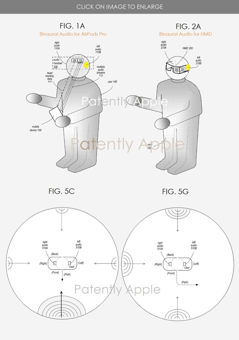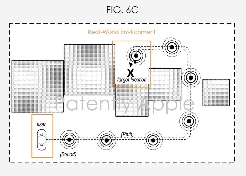 專利圖5C和5G示出了基于空間音頻導航系統(tǒng)的各種空間音頻導航方法。蘋果專利圖6C示出了離散路徑追蹤方法,其中聲音沿著路徑以離散間隔移動。在一些實施例中,當聲音到達路徑末端時,便返回到路徑的起點并且重復該過程。