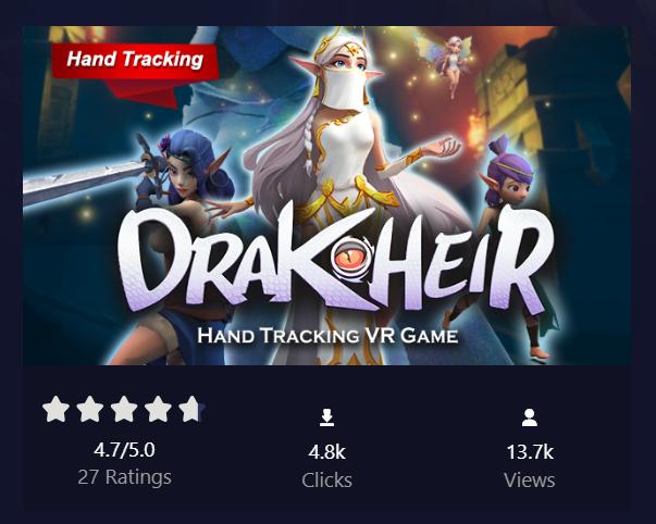 這款游戲由國內(nèi)數(shù)字創(chuàng)意公司恒信東方旗下XR開發(fā)團(tuán)隊(duì)YongHo工作室開發(fā),5月9日在Sidequest平臺(tái)開放試玩版α測試,測試版共有半小時(shí)左右游戲內(nèi)容,包括1個(gè)箱庭中的4個(gè)關(guān)卡,其中有3種敵人和1個(gè)BOSS,以及投擲類、卷軸類、融合類、防御類等8個(gè)比較有代表性的元素魔法。自試玩版α測試開啟以來,「Drakheir」僅在兩個(gè)月內(nèi)便達(dá)到近5000次下載量,游戲評分更是高達(dá)4.7分。