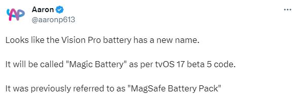 “Magic Battery”可續(xù)航Apple Vision Pro兩小時(shí),曾稱為“MagSafe Battery Pack”,與支持iPhone的外部電池同名,如今,獨(dú)立蘋(píng)果代碼研究員“aaronp613”發(fā)現(xiàn)了對(duì)該名稱的新引用。