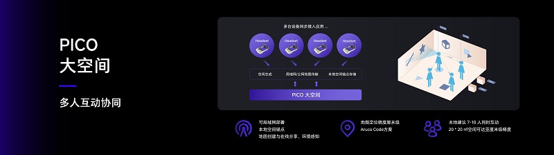 PICO Business基于虛實融合技術(shù),還推出了大空間多人互動協(xié)同解決方案。用戶在大空間環(huán)境下,使用一臺設(shè)備掃描周邊環(huán)境,創(chuàng)建地圖并共享到所有用戶的頭顯中,就可同時實現(xiàn)娛樂、培訓(xùn)、營銷中的多人交互和定位。該方案既可應(yīng)用于多人CS、真人對戰(zhàn)、劇本殺、密室逃脫等一系列的線下娛樂場景,也可以擴(kuò)展到培訓(xùn)、營銷、會議等多人互動協(xié)同的辦公場景。