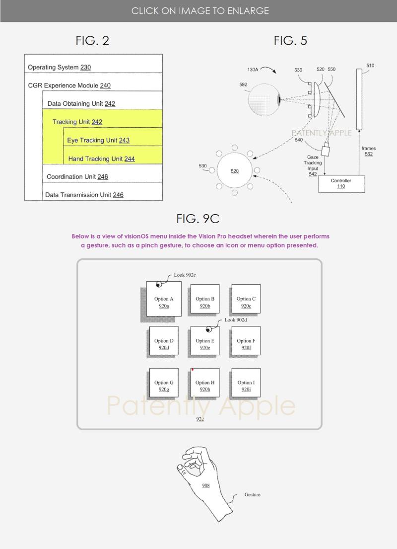 蘋(píng)果專利圖2是一個(gè)框圖,說(shuō)明了計(jì)算機(jī)系統(tǒng)的控制器,該控制器被配置為管理和協(xié)調(diào)用戶的CGR體驗(yàn),包括眼睛(#243)和手部跟蹤(#244);圖5是示出被配置為捕獲用戶凝視輸入的計(jì)算機(jī)系統(tǒng)的眼動(dòng)追蹤單元框圖;圖9C示出了經(jīng)由顯示生成組件在用戶界面上顯示三維環(huán)境的電子設(shè)備(Vision Pro)。