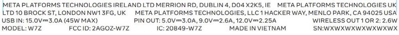 信息標簽指出,底座基于45W USB輸入,支持無線輸出(每個手柄一個)以及三個充電接觸針(與Quest 3的三個引腳針相匹配)。