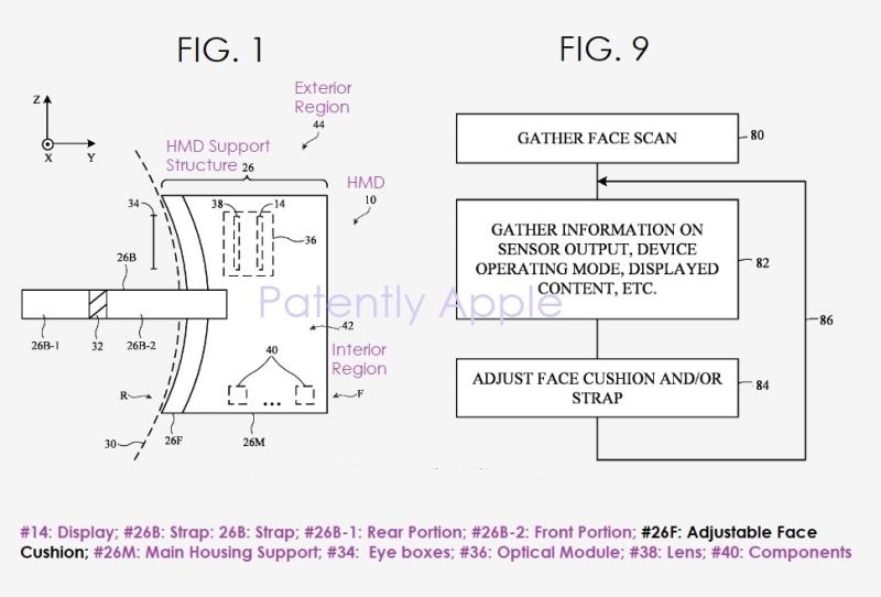 蘋果專利圖1示出了本發(fā)明涉及HMD;圖9涉及使用具有可調(diào)節(jié)面部襯墊的頭戴式設(shè)備的說明性操作流程圖。