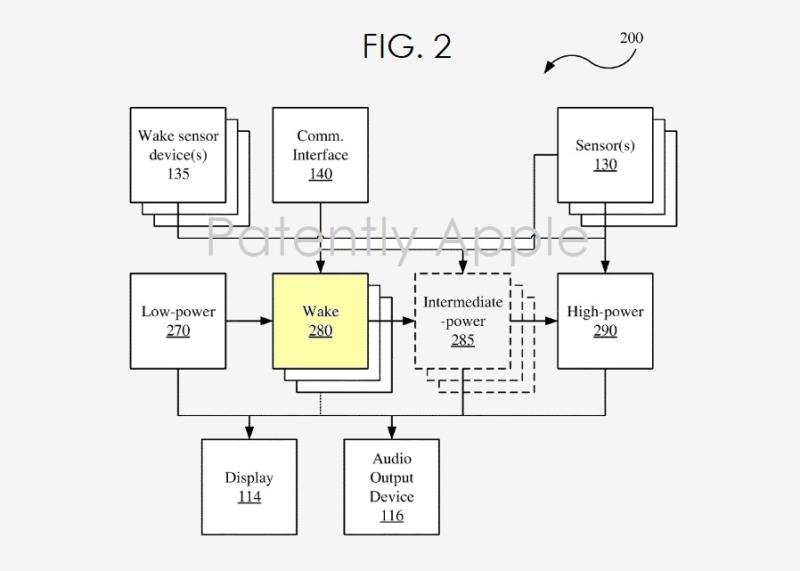 另外一項蘋果專利涉及頭顯喚醒控制系統(tǒng),蘋果專利指出顯示系統(tǒng)包括頭戴式顯示單元和喚醒控制系統(tǒng)。頭戴式顯示單元向用戶提供內(nèi)容并且可在低功率狀態(tài)和高功率狀態(tài)下運行,其中高功率狀態(tài)比低功率狀態(tài)消耗更多功率來向用戶提供內(nèi)容。喚醒控制系統(tǒng)確定何時在高功率狀態(tài)下運行,喚醒控制系統(tǒng)評估低功率第一喚醒標(biāo)準,在滿足第一喚醒標(biāo)準時評估具有比第一喚醒標(biāo)準更高功率的第二喚醒標(biāo)準,并且使得頭戴式顯示單元在高功率下操作滿足第二喚醒標(biāo)準時的狀態(tài)。
