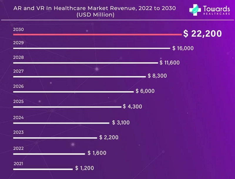 市場(chǎng)調(diào)研機(jī)構(gòu)Towards Healthcare發(fā)布的一份研究報(bào)告顯示,到2027年,全球AR和VR醫(yī)療保健領(lǐng)域市場(chǎng)規(guī)模將超過(guò)83億美元;到2030年市場(chǎng)規(guī)模將達(dá)到222億美元。