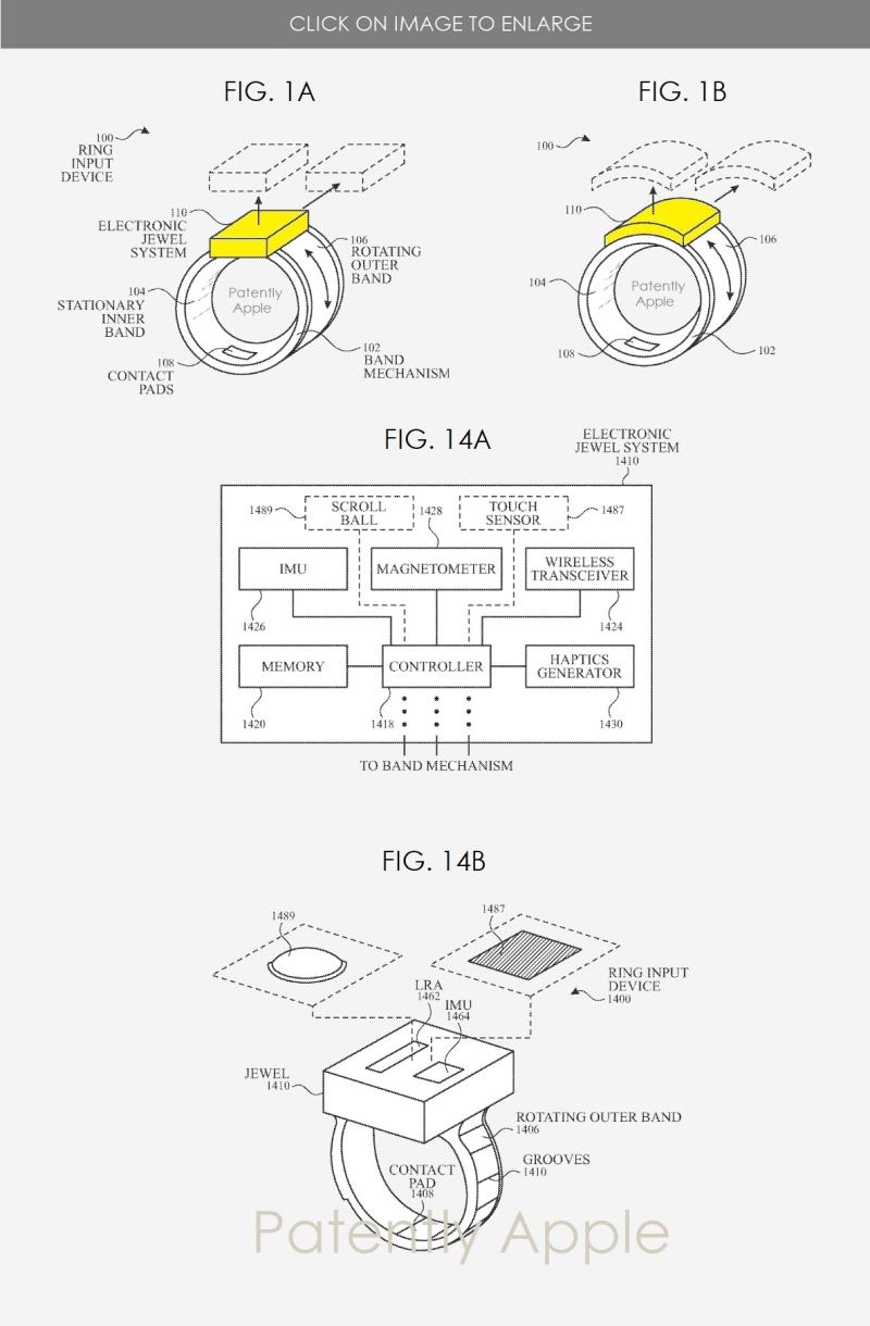 蘋果專利圖1A-1B示出了環(huán)形輸入設(shè)備的不同配置;圖14A為包括滾動(dòng)球和觸摸傳感器的環(huán)形輸入裝置的電子戒指系統(tǒng)的系統(tǒng)框圖;圖14B為包括具有滾動(dòng)球和觸摸傳感器的電子戒指系統(tǒng)的環(huán)輸入設(shè)備的透視圖。