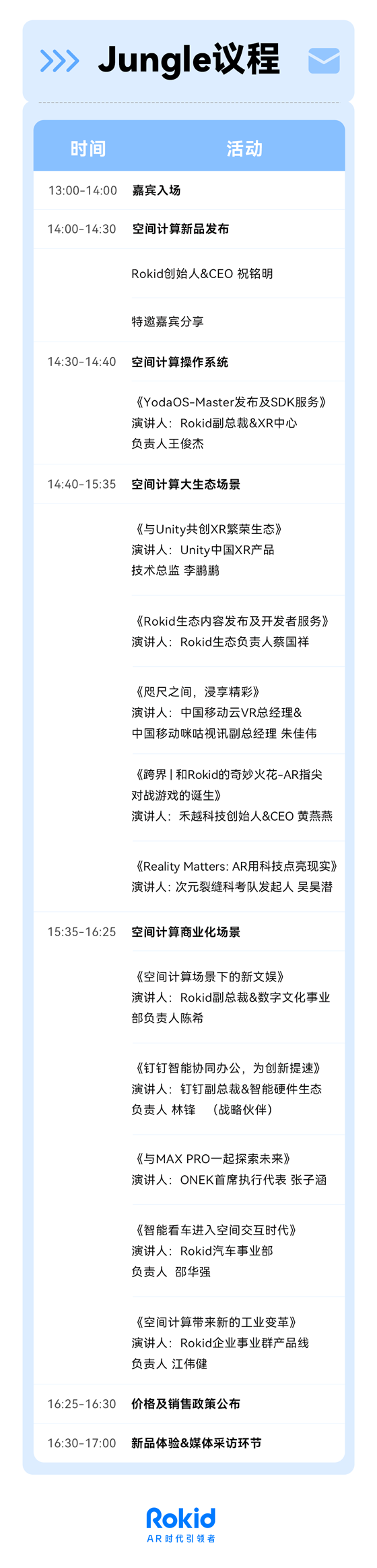 本次Jungle上,Rokid將發(fā)布聚焦空間計(jì)算新體驗(yàn)的全新空間產(chǎn)品,與參會(huì)的政府代表、企業(yè)家、投資者、開發(fā)者、媒體等,共同開啟AR時(shí)代里程碑時(shí)刻!