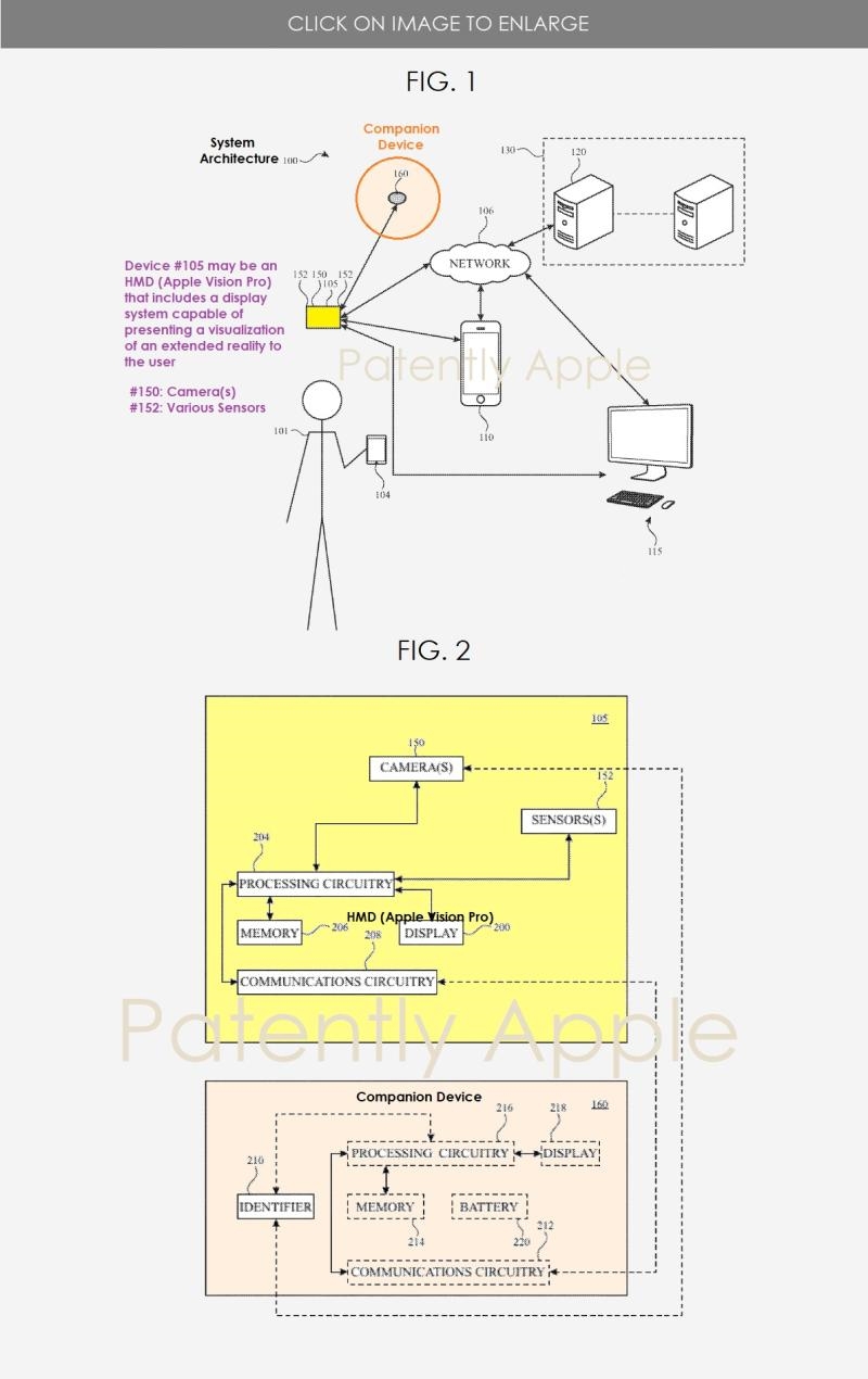 蘋果專利圖1示出了包括可以實現(xiàn)本系統(tǒng)的各種電子設備的示例系統(tǒng)架構。該架構覆蓋多種設備,但該專利的重點是HMD(Apple Vision Pro),其中包括可向用戶呈現(xiàn)擴展現(xiàn)實環(huán)境可視化的顯示系統(tǒng)。