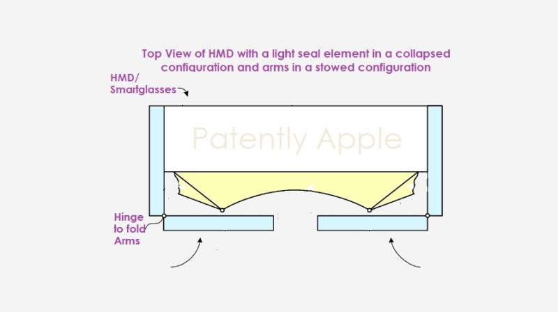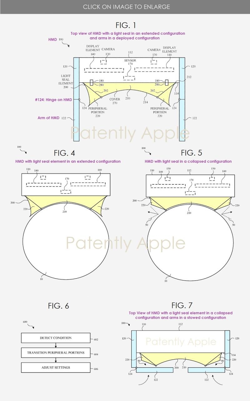 蘋(píng)果專(zhuān)利圖1示出了具有處于延伸配置的光密封件和處于展開(kāi)配置的頭戴式設(shè)備的頂視圖;圖4示出了佩戴具有處于延伸配置光密封元件的頭戴式設(shè)備的用戶的頂視圖;圖5示出了佩戴具有處于折疊配置光密封元件的頭戴式設(shè)備用戶的頂視圖。