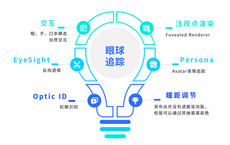 路偉成表示,基于眼球追蹤技術(shù),蘋果Vision Pro實(shí)現(xiàn)了注視點(diǎn)渲染、自動(dòng)瞳距調(diào)節(jié)、眼控交互、Optic ID(虹膜識(shí)別)、Eyesight(反向透視)、Persona(虛擬人表情追蹤)等一系列實(shí)用且極具科技感的功能和體驗(yàn),“第一次將眼球追蹤技術(shù)在XR領(lǐng)域的真正潛力呈現(xiàn)給世人。”