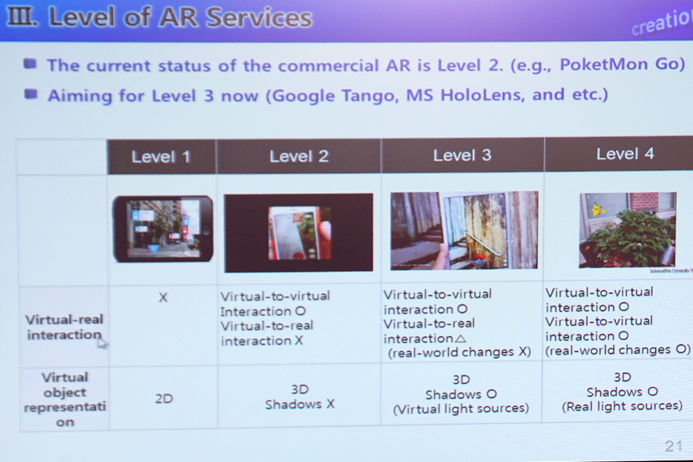 三星還進(jìn)一步討論了AR的概念以及VR和AR的4個(gè)不同的等級(jí)(如下圖),表示三星將把它的產(chǎn)品推向第三個(gè)等級(jí)。該技術(shù)允許用戶和現(xiàn)實(shí)環(huán)境中的目標(biāo)物體交互,這有點(diǎn)類似于Pokemon GO中的精靈怪通過AR選項(xiàng)在玩家的世界中產(chǎn)卵一樣。需要指出的是,為了能夠進(jìn)一步推進(jìn)AR技術(shù),三星電子也在密切關(guān)注微軟的HoloLens以及Magic Leap的原型機(jī)。實(shí)際上三星的副總甚至表示有存在和Magic Leap合作的可能。