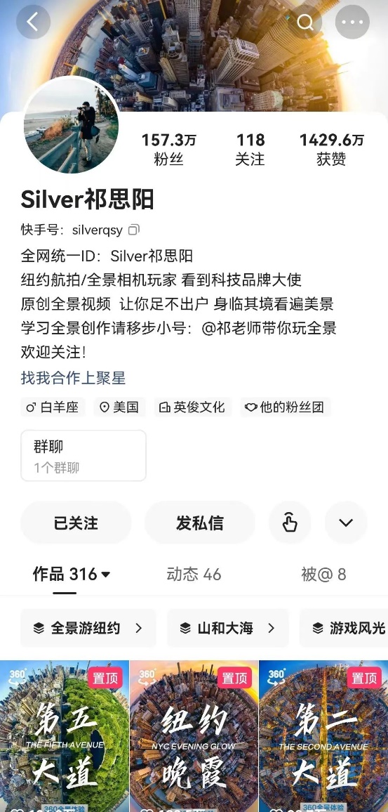 對于全景視頻,我之前主要是通過VR頭顯進行觀看。不過在本次交流過程中,當我打開快手,用手機觀看英俊文化簽約的幾位博主的全景視頻,還是感覺大受震撼。比如擁有百萬粉絲的大V“Silver祁思陽”,他拍攝的鳥瞰紐約全景照片在手機屏幕中呈現(xiàn)出極高的質(zhì)感,輕輕轉(zhuǎn)動手機,美麗的城市夜色一覽無余。而在另外一條同樣精美的視頻中,我還聽到這樣一段背景音:“拍同款全景視頻,選圓周率全景時光相機?!?/p>