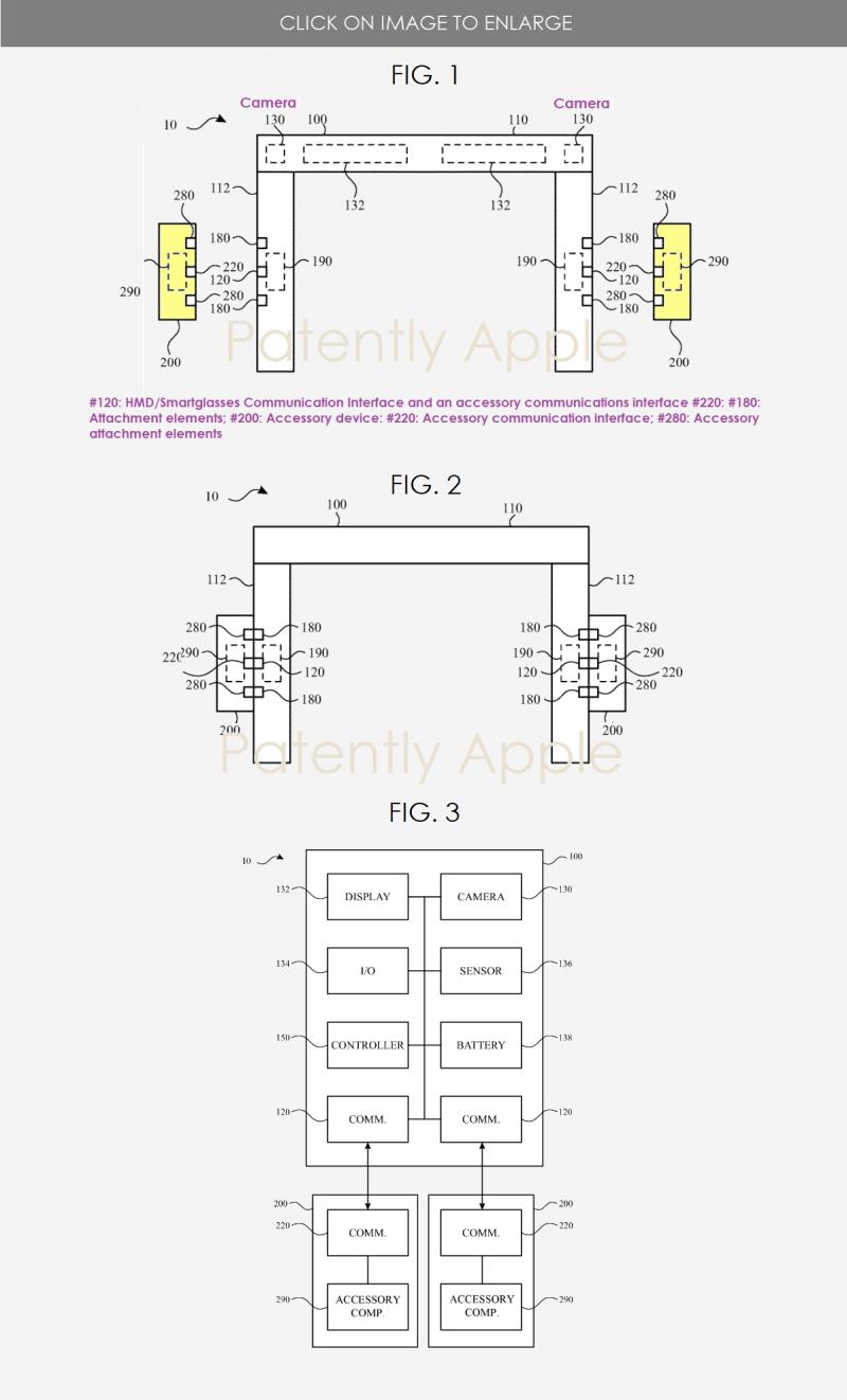 蘋果專利圖1和2示出了提供附件連接系統(tǒng)的HMD/智能眼鏡;圖3示出了包括頭戴式設(shè)備和一個或多個附件設(shè)備系統(tǒng)的框圖。