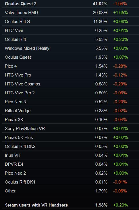 近日,Steam平臺公布了2023年7月的軟件與硬件調(diào)查報(bào)告。本月報(bào)告數(shù)據(jù)顯示,Steam平臺VR用戶占比相比6月回升了不少,達(dá)到1.93%(+0.20%)。其中,Meta Quest 2占比繼續(xù)下跌超過1個百分點(diǎn),Valve Index占比則大幅上漲,已經(jīng)超過了20%,成為本月最大的一匹黑馬。