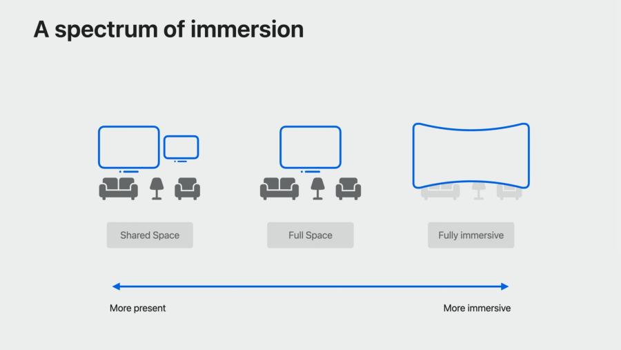 這樣的硬件特點,決定了Vision Pro這個平臺基本囊括了以往VR/AR/MR三類硬件所支持的內容形式。開發(fā)者既可以將傳統(tǒng)2D游戲直接移植到Vision Pro上,也可以將其與空間信息相結合,把自己的游戲顯示在墻壁表面或桌面上,或者是直接開發(fā)一款VR游戲,通過Vision Pro的全沉浸模式來運行。而之所以支持這么多種類型的內容,主要是由于Vision Pro提供了多種不同的空間應用場景。