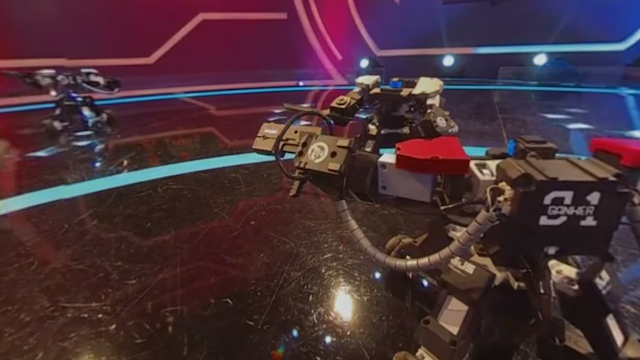 還有一點(diǎn)我想說明一下,在觀看過程中,我并沒有佩戴VR眼鏡,而是直接用手機(jī)進(jìn)行觀看的。現(xiàn)在畢竟不是所有用戶都擁有VR眼鏡,所以我想站在更大數(shù)量的用戶角度去體驗(yàn)這場(chǎng)直播,而結(jié)果讓我非常滿意。機(jī)器人格斗的比賽場(chǎng)地較小,機(jī)器人的個(gè)頭也不算大,使用VR全景拍攝正好可以全部覆蓋用戶的視野。參賽的機(jī)器人動(dòng)作迅速而靈活,如果用傳統(tǒng)拍攝很難讓觀眾看到精彩的細(xì)節(jié),而現(xiàn)在觀眾可以在很近的位置看到機(jī)器人之間激烈的對(duì)抗,這種緊張刺激感是傳統(tǒng)拍攝無法帶來的,而我當(dāng)時(shí)也感覺自己變成了一部就在旁邊觀戰(zhàn)的機(jī)器人。