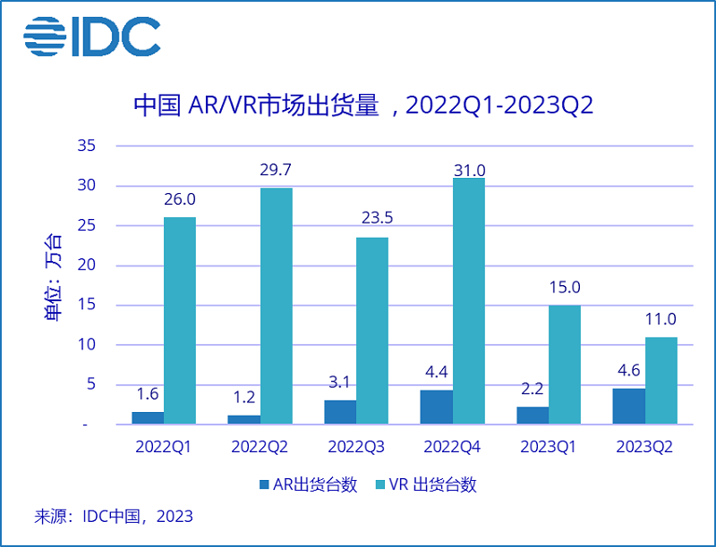 IDC數(shù)據(jù)顯示,2023年上半年,中國AR/VR頭顯出貨32.8萬臺(sales in 口徑),同比下滑44%。其中AR出貨6.8萬臺,同比上漲142%;VR出貨26萬臺,同比下滑53.3%。