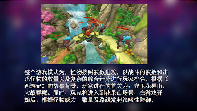 謝總首先分享了其公司旗下作品《西游保堡》的三次迭代過程?!段饔伪1ぁ肥且豢钗饔晤}材的策略塔防游戲,目前對應(yīng)的平臺是HTC Vive。其故事基于西游又不局限于西游,團隊對故事背景的設(shè)定有女媧補天相關(guān):傳說中女媧補天的仙石有八塊落到人間,每塊落在不同的地方,妖怪聽說有仙石落下就去搶奪,而玩家的任務(wù)則是保衛(wèi)仙石,直到女媧娘娘蘇醒。關(guān)于游戲的體驗,謝飛說:“我們希望我們的游戲跟傳統(tǒng)游戲有很大區(qū)別,玩家如果不佩戴VR頭盔就無法體驗到游戲的樂趣,這是我們制作這款游戲的宗旨。”
