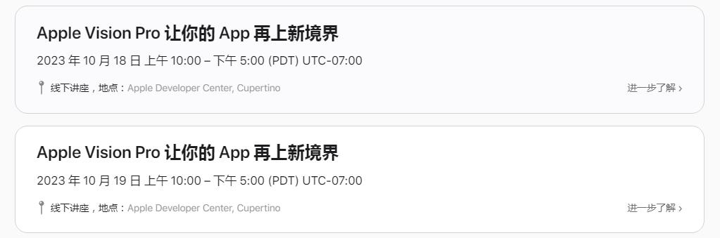 目前,蘋果開放了50多個研討會和咨詢,一些活動在網上舉辦,一些在蘋果總部庫比蒂諾舉辦。其中大多數活動都是在線召開,并向世界各地的開發(fā)者開放,但涉及Apple Vision Pro的活動在庫比蒂諾Apple Park園區(qū)的Apple開發(fā)者中心進行。