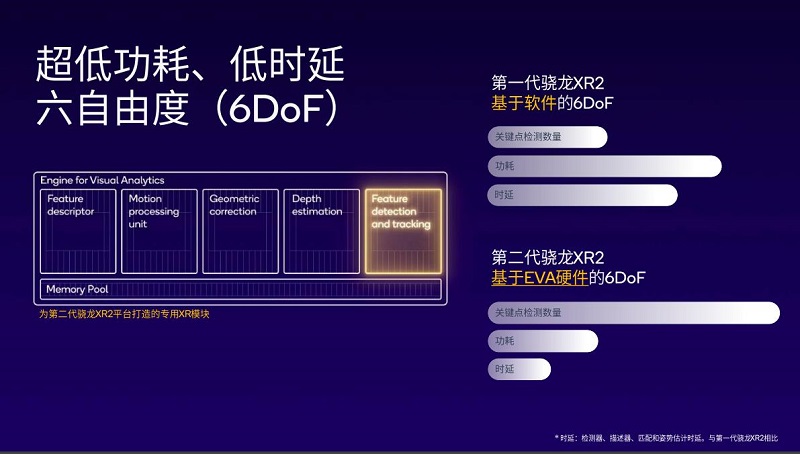 而除了AI引擎能力的大幅提升之外,高通還實(shí)現(xiàn)了6DoF中的特征探測(cè)和追蹤(Feature detection and tracking)功能從軟件向芯片硬件視覺分析引擎(Engine for Visual Analytics)的遷移,不僅提升了性能實(shí)現(xiàn)了關(guān)鍵點(diǎn)檢測(cè)數(shù)量的的大幅提升,同時(shí)還大幅度降低了該功能的功耗和時(shí)延。