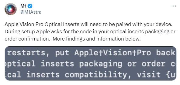 根據(jù)代碼爆料者@M1Astra的帖子,Apple Vision Pro光學(xué)插入件需要配對(duì),并且需要執(zhí)行幾個(gè)步驟才能完成此操作。