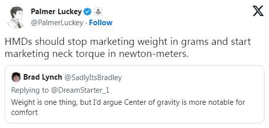 為此,Palmer Luckey提出了一個不同尋常的建議:“頭顯應該停止圍繞克來營銷重量,而應開始注重牛頓米單位?!?/p>