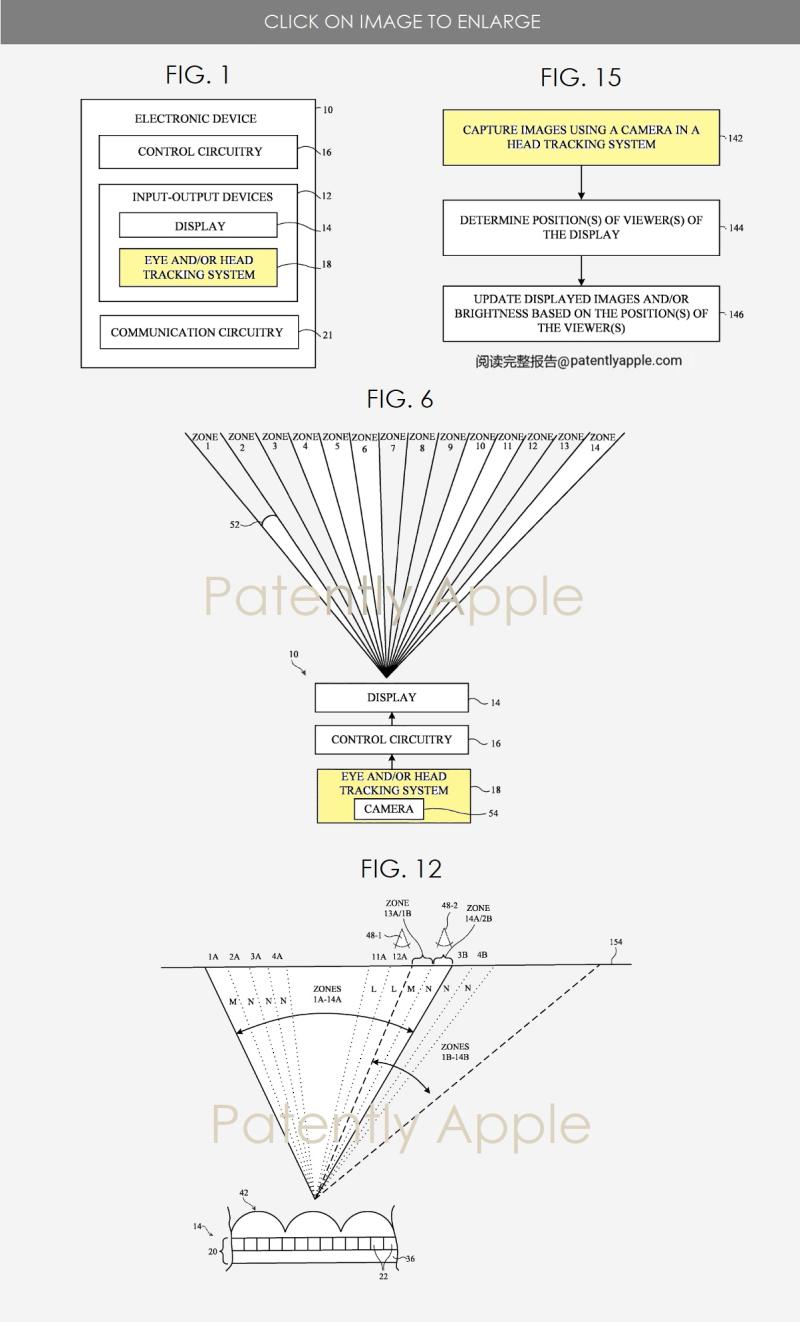 該專利涵蓋了包含光柵顯示器的HMD。柱狀顯示器具有形成在像素陣列上方的柱狀透鏡膜。雙凸透鏡被配置成能夠?qū)崿F(xiàn)立體觀看的顯示器,使得觀看者感知三維圖像;顯示器可以具有多個(gè)獨(dú)立可控的觀看區(qū)域,眼睛和/或頭部追蹤系統(tǒng)可基于攝像頭捕獲觀看者的圖像。