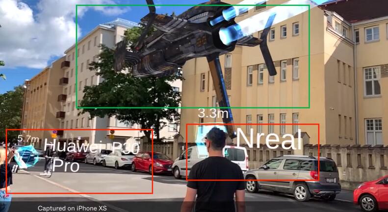 在下圖中能清楚看到,在寬闊的室外街道上,面對同一個虛擬物體(圖中綠色框選中的位置),支持XREAL Light和華為P30 Pro同時觀看,并且擁有各自位置應(yīng)該有的角度。